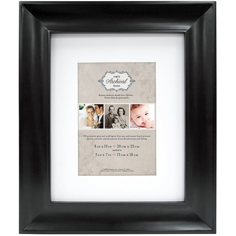 Main view Catalog Image Angled Product Details MCS® ARCHIVAL SERIES Black Matted 8x10/5x7 Wood frame by MCS® — The MCS Archival Series features UV protective glass, acid/lignin free mat and mount boards to protect important images for decades. Displays an 8"x10" print without its mat; a 5"x7" with mat. 1¾ inch moulding; solid wood construction. Easel back for tabletop display; or use the attached wall mounts. MCS® produces quality frames at value prices. ARCHIVAL SERIES Black Matted 8x10/5x7 Wood frame by MCS® Model #21476185 List $33.00 You pay $26.95 In stock Ships next business day [?] Your Price Match is Active Your request for a price of $0.00 for a minimum quantity of has been accepted. You have [time] left to purchase this item for $0.00 instead of $26.95 each. Find a Lower Price? We BEAT All Authorized Retailers [?] FEATURESDisplays:5"x7"Material:Wood (full grain)Finish:BlackOccasion:Business & office, Friendship, Home decorating, Team & coach gifts, Thank-Motivate-Reward, Celebrating TravelsStyle:Architectural, Classic, Contemporary, TraditionalOrientation:BothBrand:MCS®Display Type:Desktop or Wall Approx. Overall Dimensions:11 3/16"x13 3/16"x1 3/16" This item ships in its own box SHARE THIS ITEM Share on Facebook