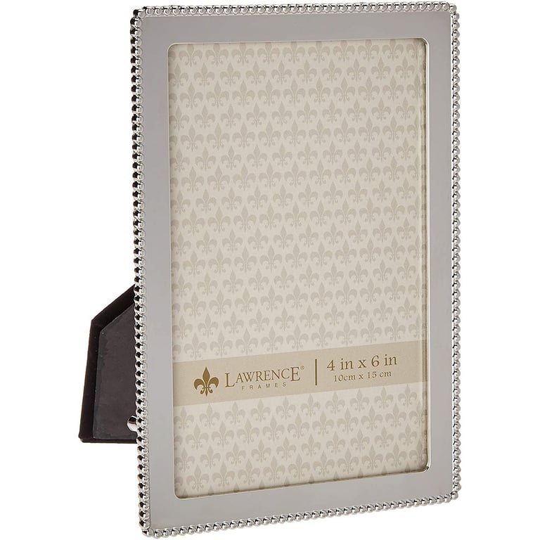 Main view Product Details Lawrence Frames® ROUNDED CORNER BEAD Silver Classic 4x6 frame — A simple and elegant mirror-finished silverplate frame with caviar-bead trim. Unique rounded corners create an especially softened, sophisticated silhouette.The attractive hardboard back features a dual easel for either portrait or landscape secure tabletop display. Wall mounts for easy hanging. Glare resistant glass lens. Makes a great gift. By Lawrence®, fine frames for generations. ROUNDED CORNER BEAD Silver Classic 4x6 frame Model #751148067256 List $26.50 You pay $18.95 Introductory Price In stock Ships next business day [?] Your Price Match is Active Your request for a price of $0.00 for a minimum quantity of has been accepted. You have [time] left to purchase this item for $0.00 instead of $18.95 each. Find a Lower Price? We BEAT All Authorized Retailers [?] FEATURESDisplays:4"x6"Material:SilverplateFinish:SilverOccasion:Birthday, Business & office, Employee honors, WeddingStyle:Classic, Contemporary, TraditionalOrientation:BothBrand:Lawrence Frames®Display Type:Desktop or Wall Approx. Overall Dimensions:4 5/8"x6 5/8"x5/8" This item ships in its own box SHARE THIS ITEM Share on Facebook