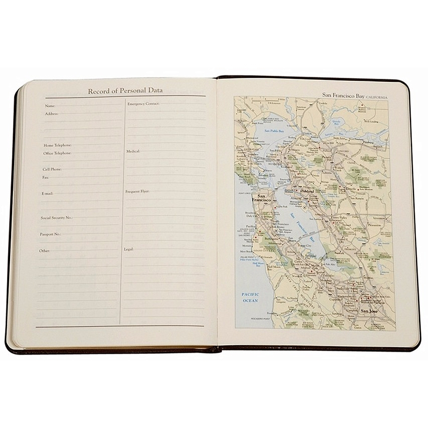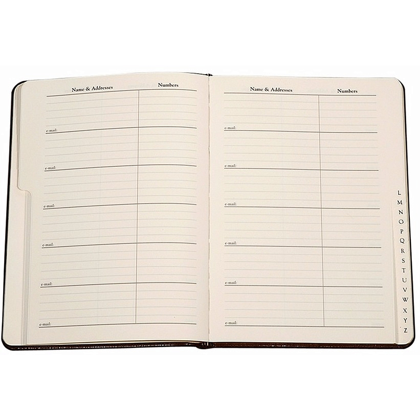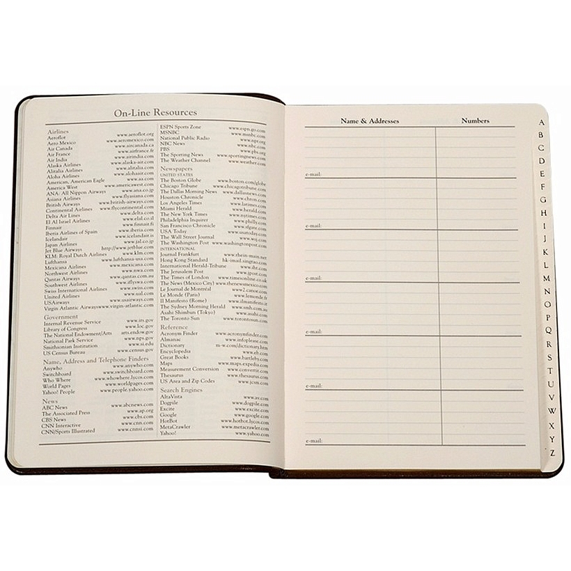 This sleek and lightweight bound address book is ideal for home or office. Includes A-to-Z tabs and full-color maps of U.S. and major international cities. Special features include a birthday/anniversary record and a perpetual calendar.