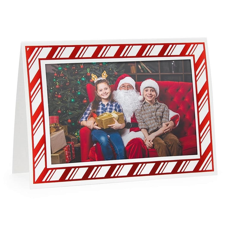Back to results Scroll Items 5782 of 11046 Main view Product Details Collectors Gallery Embossed CANDY CANE<br>premium photo insert Holiday Card (sold in 10s) — Inside Greeting: blankA white card with red foil candy cane design. Simply slide your picture behind the window opening to create an instant personalized photo card. Cards are full-color throughout. The front color carries through to the inside and back of the card. Our Snow White card is made from a bright white paper stock. Black, metallic gold or any color ink looks best for writing inside. Blank inside (optional foil imprinting) Photo Insert Cards overall measure 5"x7" with 3½"x5½" window cover opening Side-load construction for fast assembly with your prints Accommodate vertical or horizontal 4"x6" prints Envelopes included with your order. Additional envelopes available - see ACCESSORIES Can be used as an instant mat in 5"x7" frames- or add to your scrapbooking albums Folders are individually priced; sold in 10's. Made in America. Personalizing available - ADD item to CART to see link, including custom graphics and options. Embossed CANDY CANE premium photo insert Holiday Card (sold in 10s) Model #021352011032 List $25.00 You pay $18.90 ( set of 10 / $1.89 ea ) This item can be expected to ship by 02/10/2026. Order now by clicking ADD TO CART (below); you are only charged when we actually ship. Or, Click here to be automatically notified when it comes back in stock. Your Price Match is Active Your request for a price of $0.00 for a minimum quantity of has been accepted. You have [time] left to purchase this item for $0.00 instead of $1.89 each. Find a Lower Price? We BEAT All Authorized Retailers [?] FEATURESDisplays:4"x6"Material:Card-stockFinish:Red, WhiteOccasion:Inspirational, ChristmasStyle:ContemporaryOrientation:BothDisplay Type:not applicable n/a Approx. Overall Dimensions:5"x7" SHARE THIS ITEM Share on Facebook