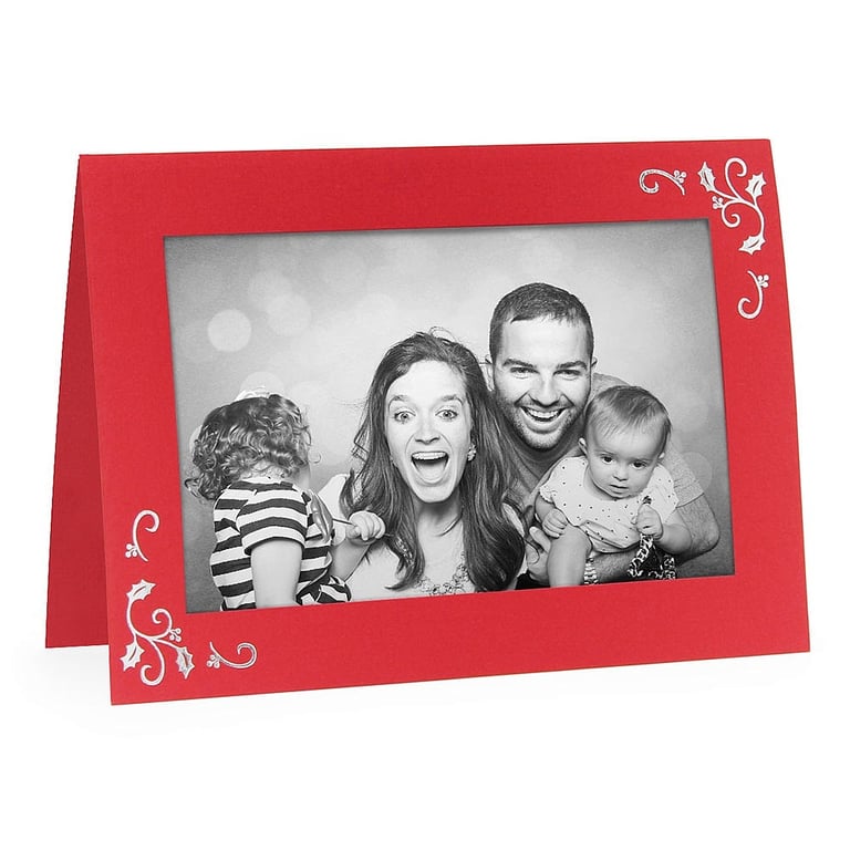 Main view sample Product Details Collectors Gallery Embossed HOLLY CORNERS Premium 4x6 Photo insert Holiday Card (sold in 10s) — Inside Greeting: blank Holds a 4" x 6" photo on the front cover of the card! A red card with silver foil holly corners. Simply slide your picture behind the window opening to create an instant personalized photo card.Cards are full-color throughout. The front color carries through to the inside and back of the card. Our Red is a deep, bright solid color red. Black or metallic silver ink looks best for writing inside. Features & Information 5" x 7" folded card with 3 ½" x 5 ½" window opening Holds a 4" x 6" photo, picture or print Photo slides into the front of the card Blank inside (optional foil imprinting) For horizontal or vertical photographs Includes white mailing envelopes Acid-free & archival paper stock Made in the USA Folders are individually priced; sold in 10's. Made in America. Personalizing available - ADD to CART to see link and options. Embossed HOLLY CORNERS Premium 4x6 Photo insert Holiday Card (sold in 10s) Model #021352011070 List $25.00 You pay $18.90 ( set of 10 / $1.89 ea ) This item can be expected to ship by 02/10/2026. Order now by clicking ADD TO CART (below); you are only charged when we actually ship. Or, Click here to be automatically notified when it comes back in stock. Your Price Match is Active Your request for a price of $0.00 for a minimum quantity of has been accepted. You have [time] left to purchase this item for $0.00 instead of $1.89 each. Find a Lower Price? We BEAT All Authorized Retailers [?] FEATURESDisplays:4"x6"Material:Card-stockFinish:Red, SilverOccasion:Inspirational, ChristmasStyle:ContemporaryOrientation:BothDisplay Type:not applicable n/a Approx. Overall Dimensions:5"x7" SHARE THIS ITEM Share on Facebook