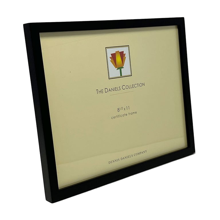 Main view Product Details Dennis Daniels® The GALLERY WOODS Black certificate 8.5x11 frame by Dennis Daniels® — The GALLERY WOODS 'W41' certificate frame in ebony-black stain is a truly superb choice for document and certificate display. Hand-crafted of solid hardwood with tailed corners and exact fitting back. Contemporary styling in a minimal footprint, that is equally stylish for desktop or wall use. Glare resistant glass with high quality sanded edges. Black hard-board back easel for both horizontal and vertical presentation and integrated wall mount included for easy hanging.Frame edge is a very striking ½" all-around.Crafted by Dennis Daniels® of California, the beautiful frame people. The GALLERY WOODS Black certificate 8.5x11 frame by Dennis Daniels® Model #782680005284 List $24.50 You pay $19.95 This item is currently out of stock and we do not have an expected date at the present time. click here to be automatically notified when it comes back in stock or email merchandising@sendaframe.com for availability information. You can place this item in your shopping cart. It will be added to the 'saved for later' section. Your Price Match is Active Your request for a price of $0.00 for a minimum quantity of has been accepted. You have [time] left to purchase this item for $0.00 instead of $19.95 each. Find a Lower Price? We BEAT All Authorized Retailers [?] FEATURESDisplays:8.50"x11"Material:Wood (full grain)Finish:BlackOccasion:Business & office, Corporate gifts, Employee honors, Home decorating, Teacher gifts, Team & coach gifts, Thank-Motivate-RewardStyle:Classic, Architectural, Minimal, Contemporary, TraditionalOrientation:BothBrand:Dennis Daniels®Display Type:Desktop or Wall Approx. Overall Dimensions:11 3/4"x9 1/4" This item ships in its own box SHARE THIS ITEM Share on Facebook