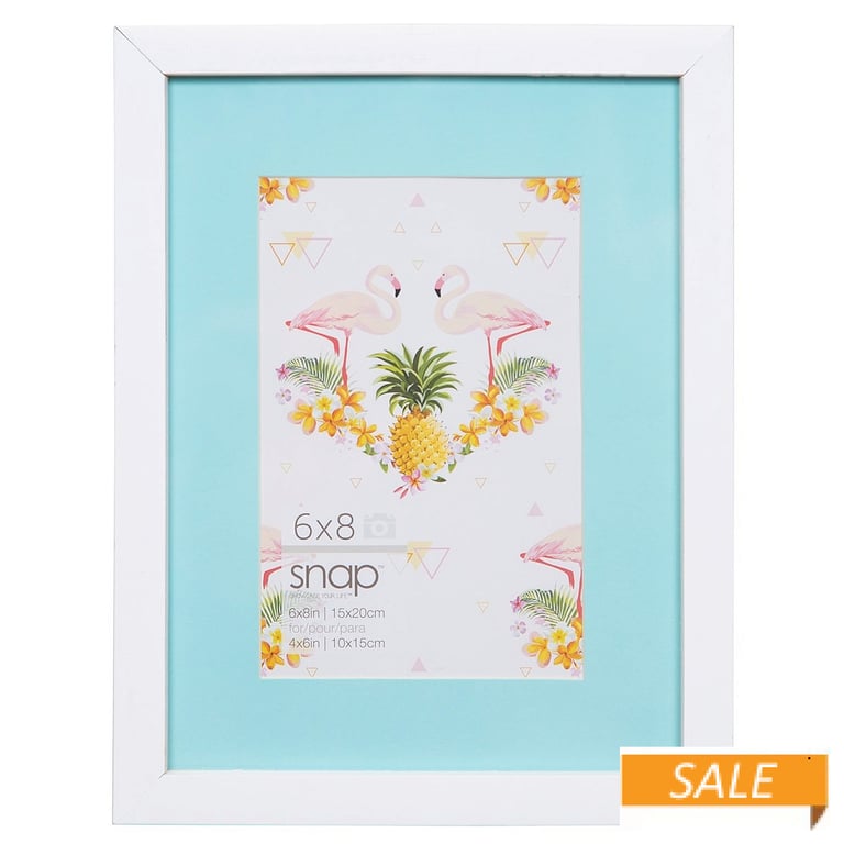 Product Details SNAP WHITE LINEAR Frame w/Turquoise Mat 6x8/4x6 by SNAP™ — Show-off your print with this white furniture-finished solid wood frame. Displays a 4"x6" print with its turq mat; a 6"x8" without mat. Wall mounts are permanently" attached to the backing, out of sight. Easel back for tabletop display. Glare resistant glass lens. Crafted by SNAP™, a divison of the Nielsen Bainbridge Group. WHITE LINEAR Frame w/Turquoise Mat 6x8/4x6 by SNAP™ Model #038555503226 List $12.50 You pay $5.90 In stock Ships next business day [?] Your Price Match is Active Your request for a price of $0.00 for a minimum quantity of has been accepted. You have [time] left to purchase this item for $0.00 instead of $5.90 each. Find a Lower Price? We BEAT All Authorized Retailers [?] FEATURESDisplays:4"x6"Material:Wood (mdf/engineered)Finish:Turquoise, WhiteOccasion:Friendship, Mother`s Day, New baby, Sweet 16, Thank-Motivate-RewardStyle:Bold Colors, Contemporary, Minimal, Teens & tweensOrientation:BothBrand:SNAPDisplay Type:Desktop or Wall Approx. Overall Dimensions:6 7/8"x8 7/8"x11/16" This item ships in its own box SHARE THIS ITEM Share on Facebook