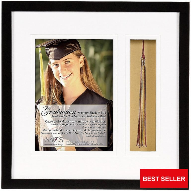 Back to results Scroll Items 117 of 11039 Main view Product Details MCS® GRADUATION MEMORIES 5x7 Frame and Tassel Holder — For the graduate and family, the GRADUATION MEMORIES frame will be a treasured remembrance of the special day.Ebony black square-corner frame construction in extremely realistic mdf wood. Glare resistant glass lens.Space in the professionally cut off-white double mat for your 5"x7" photo and 1½"w x 6½"h tassel.Personalizing, on the mat, is offered in our CART. Add the item to a CART on SendAFrame.com click Personalize This Item. By MCS®. GRADUATION MEMORIES 5x7 Frame and Tassel Holder Model #044021124574 List $26.50 You pay $20.95 In stock Ships next business day [?] Your Price Match is Active Your request for a price of $0.00 for a minimum quantity of has been accepted. You have [time] left to purchase this item for $0.00 instead of $20.95 each. Find a Lower Price? We BEAT All Authorized Retailers [?] FEATURESDisplays:5"x7"Material:Wood (mdf/engineered)Finish:BlackOccasion:GraduationStyle:Classic, Traditional, Words & whimsyBrand:MCS®Display Type:Wall Only Approx. Overall Dimensions:10 1/2"x10 1/2"x11/16" SHARE THIS ITEM Share on Facebook