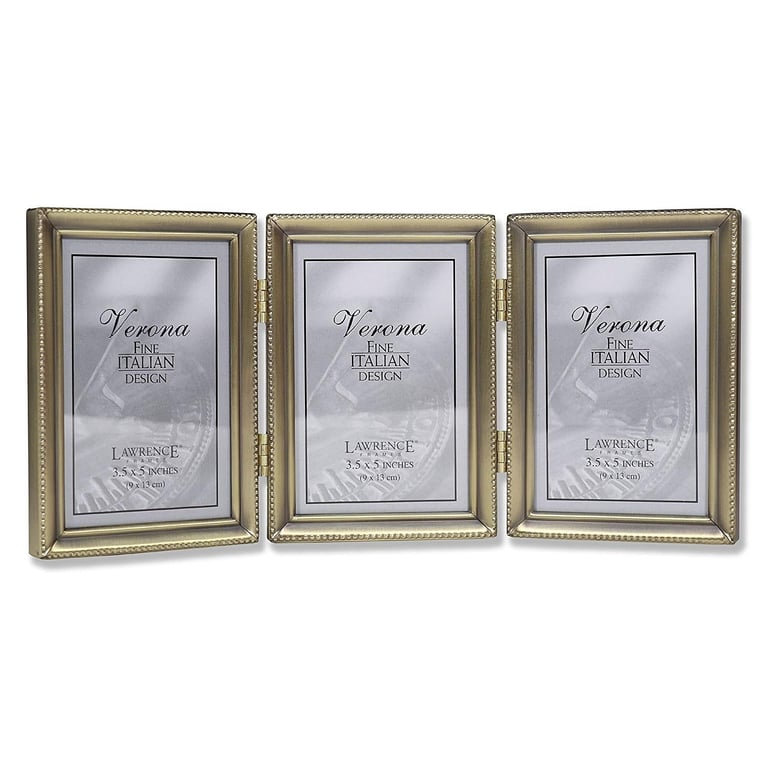 Main view Product Details Lawrence Frames® Classic antiqued gold-tone hinged 3½x5 triple frame — Antiqued goldtone frame is now available in a hinged trio.Satin finished, it is beautifully crafted with tightly joined seams and corners. Nicely backed for wonderful desk appeal. Glare resistant glass lenses.By Lawrence®. Click the Lawrence Frame collection to shop the entire line. Classic antiqued gold-tone hinged 3½x5 triple frame Model #751148034975 List $40.00 You pay $26.95 In stock Ships next business day [?] Your Price Match is Active Your request for a price of $0.00 for a minimum quantity of has been accepted. You have [time] left to purchase this item for $0.00 instead of $26.95 each. Find a Lower Price? We BEAT All Authorized Retailers [?] FEATURESDisplays:3.50"x5"Material:Gold plateOccasion:Anniversary, Birthday, Good luck, Mother`s Day, Retirement, Teacher gifts, Thank-Motivate-Reward, Celebrating Travels, WeddingStyle:Antique, Classic, TraditionalOrientation:Vertical OnlyBrand:Lawrence Frames®Display Type:Desktop or Wall This item ships in its own box SHARE THIS ITEM Share on Facebook