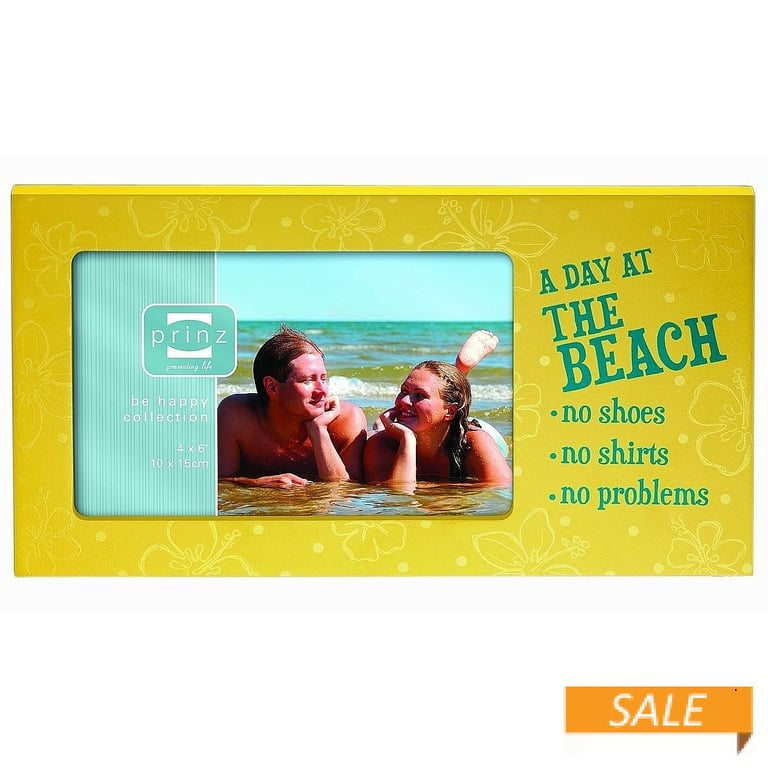 Product Details Prinz® frames & albums Yellow JUST BEACHY wood frame by Prinz® — A DAY AT THE BEACH no shoes no shirts no problems A fun tropical themed frame to highlight that special photo Beautifully articulated, this very affordable piece is terrific for brightening a room and enhancing a playful summer print Easel back for tabletop display; Wall hooks are included for easy hanging. Glare resistant glass lenses Produced by Prinz USA. Yellow JUST BEACHY wood frame by Prinz® Model #81749107 List $9.50 You pay $4.90 In stock Can be shipped today [?] Your Price Match is Active Your request for a price of $0.00 for a minimum quantity of has been accepted. You have [time] left to purchase this item for $0.00 instead of $4.90 each. Find a Lower Price? We BEAT All Authorized Retailers [?] FEATURESDisplays:4"x6"Material:Wood (full grain)Finish:YellowOccasion:Celebrating Travels, Home decorating, Weekend Host GiftsStyle:Contemporary, Country French, Preppy, Sports & leisure, Tropical, Coastal, Nautical & ShoreOrientation:Horizontal OnlyBrand:Prinz® frames & albumsDisplay Type:Desktop or Wall This item ships in its own box SHARE THIS ITEM Share on Facebook