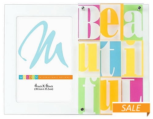 Back to results Scroll Items 9608 of 11350 Product Details Malden Designs® BEAUTIFUL keepsake frame by Malden® — BEAUTIFUL is a special celebration keepsake frame to share and cherish. Bold colors and fun graphics adorn this adorable frame. Glare resistant glass lens. Attractive hardboard backing for desktop display.Crafted by Malden®. BEAUTIFUL keepsake frame by Malden® Malden Designs® FALL CELEBRATION Savings - ends SundayBuy More / Save More * Add this item to your cart for the full details of this promotion. Conditions may apply. Model #87131681 List $12.50 You pay $6.90 In stock Ships next business day [?] Your Price Match is Active Your request for a price of $0.00 for a minimum quantity of has been accepted. You have [time] left to purchase this item for $0.00 instead of $6.90 each. Find a Lower Price? We BEAT All Authorized Retailers [?] FEATURESDisplays:4"x6"Material:Wood (mdf/engineered)Finish:Blue, Pink, WhiteOccasion:Birthday (child), Christmas, Friendship, Inspirational, Valentine`s DayStyle:Tropical, Bold Colors, Contemporary, Sports & leisure, Teens & tweens, Words & whimsy, Expressions > ready madeOrientation:Vertical OnlyBrand:Malden Designs®Display Type:Desktop or Wall Approx. Overall Dimensions:9 5/8"x7 1/2"x3/4" This item ships in its own box SHARE THIS ITEM Share on Facebook