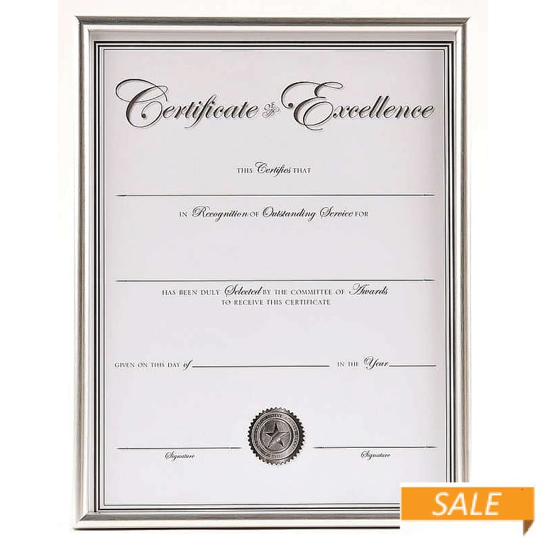Main view Product Details Connoisseur® Silver Diploma/Certificate 11x8½ frame by DAX® — An attractive frame for corporate style display of certificates and diplomas. Satin-silver engineered MDF wood document frame protects an 8½"x11 print or certificate. Glare resistant glass lens. The two-way easel back with multiple hangers can display the frame vertically or horizontally on tabletop or wall. Crafted by Dax®, maker of serious doument frames for generations. Silver Diploma/Certificate 11x8½ frame by DAX® Model #95320517 List $16.50 You pay $6.90 In stock Ships next business day [?] Your Price Match is Active Your request for a price of $0.00 for a minimum quantity of has been accepted. You have [time] left to purchase this item for $0.00 instead of $6.90 each. Find a Lower Price? We BEAT All Authorized Retailers [?] FEATURESDisplays:8.50"x11"Material:Wood (mdf/engineered)Finish:SilverOccasion:Business & officeStyle:Classic, Contemporary, Minimal, TraditionalOrientation:BothBrand:Connoisseur®Display Type:Desktop or Wall Approx. Overall Dimensions:8 7/8"x11 3/8"x13/16" This item ships in its own box SHARE THIS ITEM Share on Facebook