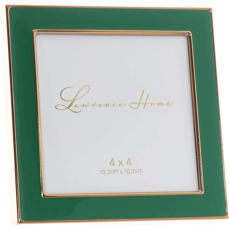Main view Product Details Lawrence Frames® Green Enamel w/Gold Trim 4x4 by Lawrence — A high quality gold plated frame with polished green enamel panel. This gold plated and lacquer coated frame has a beautiful lustrous finish. Includes a high quality black velvet backing with an easel for vertical or horizontal table top display, and hangers for vertical or horizontal wall mounting. Heavy weight metal picture frame is made with exceptional workmanship and comes individually boxed. From Lawrence®, maker of fine frames for generations. Green Enamel w/Gold Trim 4x4 by Lawrence Model #751148085458 List $22.50 You pay $17.95 This item IS in stock and can be expected to ship 11/26/2025 Your Price Match is Active Your request for a price of $0.00 for a minimum quantity of has been accepted. You have [time] left to purchase this item for $0.00 instead of $17.95 each. Find a Lower Price? We BEAT All Authorized Retailers [?] FEATURESDisplays:4"x4"Material:EnamelFinish:Gold, GreenOccasion:Business & office, Congratulations, Home decorating, Celebrating TravelsStyle:Classic, Contemporary, TraditionalBrand:Lawrence Frames®Display Type:Desktop or Wall Approx. Overall Dimensions:4 3/4"x4 3/4"x5/8" This item ships in its own box SHARE THIS ITEM Share on Facebook