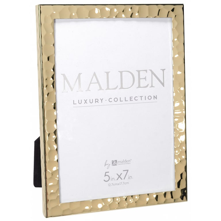 Main view Product Details Malden Designs® Hammered Gold 5x7 frame by Malden — Decorative gold metal hammered design picture frame. Cast metal picture frame is made with exceptional workmanship. Decorative hammered effect picture frame Vertical or horizontal tabletop display or can be hung on a wall with installed hangers Wipe clean with dry cloth, glass included Individually boxed By Malden Design®. Hammered Gold 5x7 frame by Malden Model #096287187268 List $16.50 You pay $14.95 This item IS in stock and can be expected to ship 01/23/2026 Your Price Match is Active Your request for a price of $0.00 for a minimum quantity of has been accepted. You have [time] left to purchase this item for $0.00 instead of $14.95 each. Find a Lower Price? We BEAT All Authorized Retailers [?] FEATURESDisplays:5"x7"Material:Metallic (all)Finish:GoldOccasion:Birthday, Business & office, Friendship, Home decorating, Thank-Motivate-RewardStyle:Contemporary, SophisticatedOrientation:BothBrand:Malden Designs®Display Type:Desktop or Wall This item ships in its own box SHARE THIS ITEM Share on Facebook