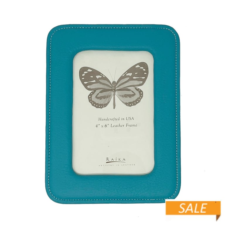 Main view Product Details Raika® Leathers RODEO TURQUOISE pebble-grain leather #171 4x6 frame by Raika® — Gorgeously crafted photo frame in genuine leather in a terrific turquoise pebble grain leather.Features a beautiful fully articulated and finished back with dual easel stand for landscape or portrait desk-top display. Crystal clear glare resistant glass lens. Hand-stitching makes this a wonderful piece to handle.Terrific feel and smell appeal! Handcrafted by Raika®, the leather people. RODEO TURQUOISE pebble-grain leather #171 4x6 frame by Raika® Model #794087217153 List $84.00 You pay $41.90 In stock Ships next business day [?] Your Price Match is Active Your request for a price of $0.00 for a minimum quantity of has been accepted. You have [time] left to purchase this item for $0.00 instead of $41.90 each. Find a Lower Price? We BEAT All Authorized Retailers [?] FEATURESDisplays:4"x6"Material:Leather (fine)Finish:Blue, TurquoiseOccasion:Birthday, Congratulations, Corporate gifts, Employee honors, Engagement, Home decorating, Housewarming, Celebrating TravelsStyle:Bold Colors, Contemporary, Romantic, PreppyOrientation:BothBrand:Raika® LeathersDisplay Type:Desktop Only Approx. Overall Dimensions:6"x8"x1/2" This item ships in its own box SHARE THIS ITEM Share on Facebook