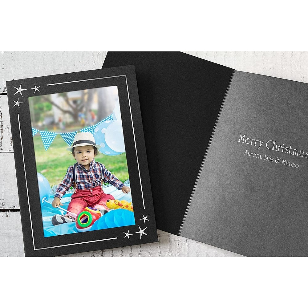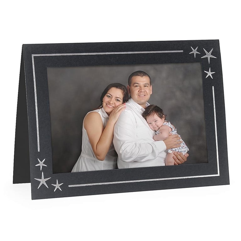 Main view Product Details Collectors Gallery Embossed STARS premium photo insert Holiday Card (sold in 10s) — Inside Greeting: blankHere, a beautifully embossed STARS border tells your recipient they they are one of a kind ! Accommodate vertical or horizontal 4"x6" prints Cards are versed with printed greeting (unless blank) Photo Insert Cards overall measure 5"x7" with 3½"x5½" window cover opening Side-load construction for fast assembly with your prints Envelopes included with your order Can be used as an instant mat in 5"x7" frames- or add to your scrapbooking albums. Folders are individually priced; sold in 10's. Made in America. Personalizing available - ADD to CART to see link and options. Crafted expressly for SendAFrame. Embossed STARS premium photo insert Holiday Card (sold in 10s) Model #021352011049 List $25.00 You pay $18.90 ( set of 10 / $1.89 ea ) This item can be expected to ship by 02/10/2026. Order now by clicking ADD TO CART (below); you are only charged when we actually ship. Or, Click here to be automatically notified when it comes back in stock. Your Price Match is Active Your request for a price of $0.00 for a minimum quantity of has been accepted. You have [time] left to purchase this item for $0.00 instead of $1.89 each. Find a Lower Price? We BEAT All Authorized Retailers [?] FEATURESDisplays:4"x6"Material:Card-stockFinish:BlackOccasion:Inspirational, ChristmasStyle:ContemporaryOrientation:BothDisplay Type:not applicable n/a Approx. Overall Dimensions:5"x7" SHARE THIS ITEM Share on Facebook