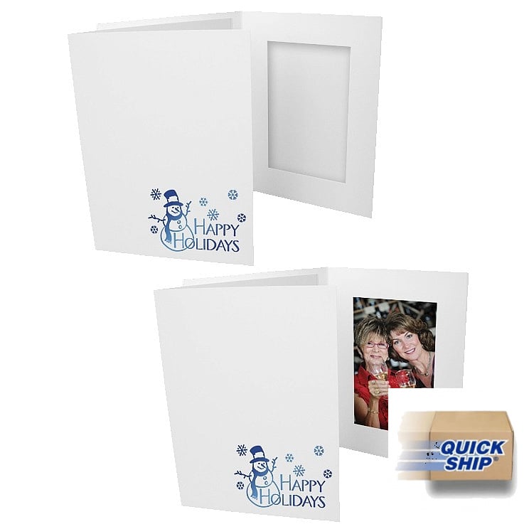 Our photo folder in white, accented with a "Happy Holidays and snowman in blue foil. The design is hot stamped (imprinted) onto the front of the folder as shown.
