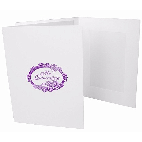 Our photo folder in white, accented with the words "Mis Quinceanera" inside a floral rose ring in purple foil. The design is hot stamped (imprinted) onto the front of the folder.