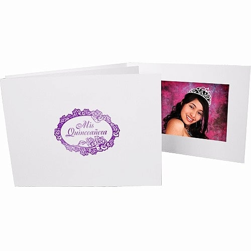 Main view Sizing Unfilled view Product Details Collectors Gallery Mis Quinceanera foil<br>on white cardboard photo folder frame — Our photo folder in white, accented with the words "Mis Quinceanera" inside a floral rose ring in purple foil. The design is hot stamped (imprinted) onto the front of the folder.Planning a Quinceanera party? This photo folder is perfect to use as photo party favors. Take photos of your special day and give all the guests their own copy inside of a beautiful Quincenera photo folder. Use as is, or personalize by adding your name, birthday or other custom details.Terrific look and feel with linen weave finish, deckled edges. Plain window border.Photo easily slides in from the side for convenient event assembly with your prints.Frame displays a 4" x 6" print or photo.See Suggested Accessories below for matching envelopes (not required).Crafted expressly for SendAFrame. Mis Quinceanera foil on white cardboard photo folder frame Model #021352153350 List $10.00 You pay $7.80 ( set of 10 / $0.78 ea ) This item can be expected to ship by 02/04/2026. Order now by clicking ADD TO CART (below); you are only charged when we actually ship. Or, Click here to be automatically notified when it comes back in stock. Your Price Match is Active Your request for a price of $0.00 for a minimum quantity of has been accepted. You have [time] left to purchase this item for $0.00 instead of $0.78 each. Find a Lower Price? We BEAT All Authorized Retailers [?] FEATURESDisplays:4"x6"Material:Card-stockFinish:White, PurpleOccasion:Birthday, Group Events + PartiesStyle:Teens & tweens, Traditional, Minimal, Eco-Friendly-RecycledOrientation:Horizontal OnlyBrand:Collectors Gallery SHARE THIS ITEM Share on Facebook