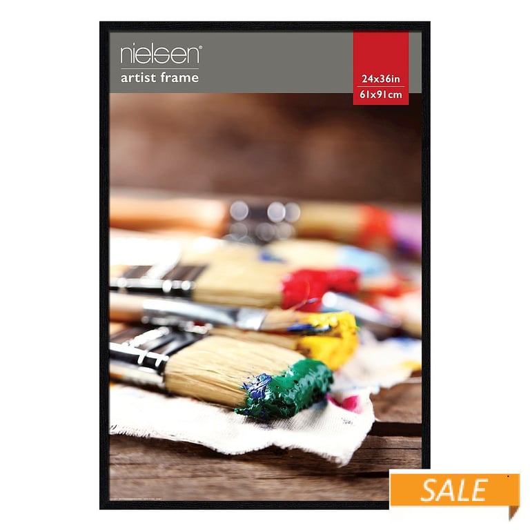 Main view Moulding Detail Product Details Nielsen · Bainbridge® Black ROYAL wood poster frame 24x36 by Nielsen® (sold in 3s) — Basic Black ROYAL wood frame displays a 24"x36" print in a traditional ¾" flat-top moulding design. ROYAL is an excellent choice to achieve a consistent look, in an opening price point, from Nielsen. Frame includes wall mounts for easy hanging, either vertical or horizontal.Acid-free backing for life-time care of your print. Glare resistant, plexi-glas lens (smaller sizes in this series may have picture frame glass. Check description). Crafted by Nielsen®. SendAFrame stocks the complete line of Nielsen-Bainbridge ready-made frames to make your projects easy. Click here to view the entire Nielsen® line. Black ROYAL wood poster frame 24x36 by Nielsen® (sold in 3s) Model #28124194 List $240.00 You pay $128.70 ( set of 3 / $42.90 ea ) In stock Ships next business day [?] Your Price Match is Active Your request for a price of $0.00 for a minimum quantity of has been accepted. You have [time] left to purchase this item for $0.00 instead of $42.90 each. Find a Lower Price? We BEAT All Authorized Retailers [?] FEATURESDisplays:24"x36"Material:Wood (full grain)Finish:BlackOccasion:Thank-Motivate-Reward, Business & office, Friendship, Home decorating, Public Area Display, Team & coach gifts, Celebrating TravelsStyle:Architectural, Classic, Contemporary, Minimal, TraditionalOrientation:BothBrand:Nielsen · Bainbridge®Display Type:Wall Only This item ships in its own box SHARE THIS ITEM Share on Facebook