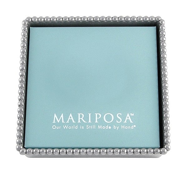 Main view Gift Boxed Product Details Mariposa® The Original BEADED NAPKIN BOX by Mariposa® — Easily identifiable by its contemporary look and beauty, Mariposa® is an easy gift to give and live with. Here, the BEADED NAPKIN BOX to use with standard cocktail napkins stock. Material: Recycled Sandcast Aluminum Dimensions: 5¾" L x 1½" H x 5¾" W Holds standard size cocktail napkins (not included) Mariposa gift boxed Designer: Michael Updike Recommended care: wash by hand with mild dishwashing soap and dry immediately People love the Mariposa casual, sculpted elegance — a strong, virtually carefree material. Their artisan handcrafted look in recycled aluminum is both pleasing to the eye and touch, as well as 100% ecologically sound. Shop the entire collection: click Mariposa® Design Collection The Original BEADED NAPKIN BOX by Mariposa® Model #808813106724 $46.00 1 available to ship, more on the way. In stock Can be shipped today [?] Your Price Match is Active Your request for a price of $0.00 for a minimum quantity of has been accepted. You have [time] left to purchase this item for $0.00 instead of $46.00 each. Find a Lower Price? We BEAT All Authorized Retailers [?] FEATURESMaterial:AluminumFinish:SilverOccasion:Anniversary, Birthday, Congratulations, Engagement, Friendship, Good luck, Weekend Host Gifts, Housewarming, Inspirational, Mother`s Day, Thank-Motivate-Reward, WeddingStyle:Contemporary, Santa Fe, Shabby Chic, Sports & leisure, Eco-Friendly-Recycled, Modern (contemporary) wip, GlamBrand:Mariposa®Display Type:not applicable n/a Approx. Overall Dimensions:5 3/4"x1 1/2"x5 3/4" This item ships in its own box SHARE THIS ITEM Share on Facebook