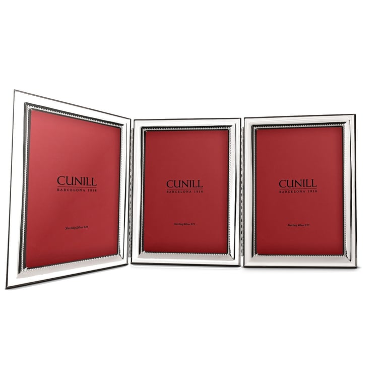 Main view Mfr authenticity mark Product Details Cunill® Italia ISABELLA Hinged 4x6 Triple Fine Sterling frame by Cunill® — This 'hard-to-find' folding hinged triple frame is a natural wedding or newborn gift.A gorgeous fine .925 sterling picture frame, it will surely become a family heirloom.The Cunill quality is unsurpassed - even to the backing which is a fitted wood piece to easily lock-in your photo. Note the signature sterling lozenge latch - a hallmark of Cunill since 1916. Each piece is debossed on front with the family mark and .925 (sterling silver), proudly giving signature to the quality this 100+ year old company has earned.Cunill silver never needs polishing - it is finely lacquered to keep it tarnish free.Crafted in and imported from Italy. To view the complete collection, visit: Cunill® Barcelona ISABELLA Hinged 4x6 Triple Fine Sterling frame by Cunill® Model #300844106556 List $580.00 You pay $488.95 In stock Can be shipped today Your Price Match is Active Your request for a price of $0.00 for a minimum quantity of has been accepted. You have [time] left to purchase this item for $0.00 instead of $488.95 each. Find a Lower Price? We BEAT All Authorized Retailers [?] FEATURESDisplays:4"x6"Material:Sterling Silver (fine)Finish:SilverOccasion:Anniversary, Baby shower, Bar & Bat Mitzvah, Birthday, Business & office, Celebrating Travels, Congratulations, Corporate gifts, Employee honors, Engagement, Good luck, Graduation, Housewarming, Mother`s Day, New baby, Retirement, Romantic, Thank-Motivate-Reward, WeddingStyle:Contemporary, Romantic, Traditional, Sophisticated, Minimal, Heirloom / HeritageOrientation:Vertical OnlyBrand:Cunill® ItaliaDisplay Type:Desktop Only This item ships in its own box SHARE THIS ITEM Share on Facebook